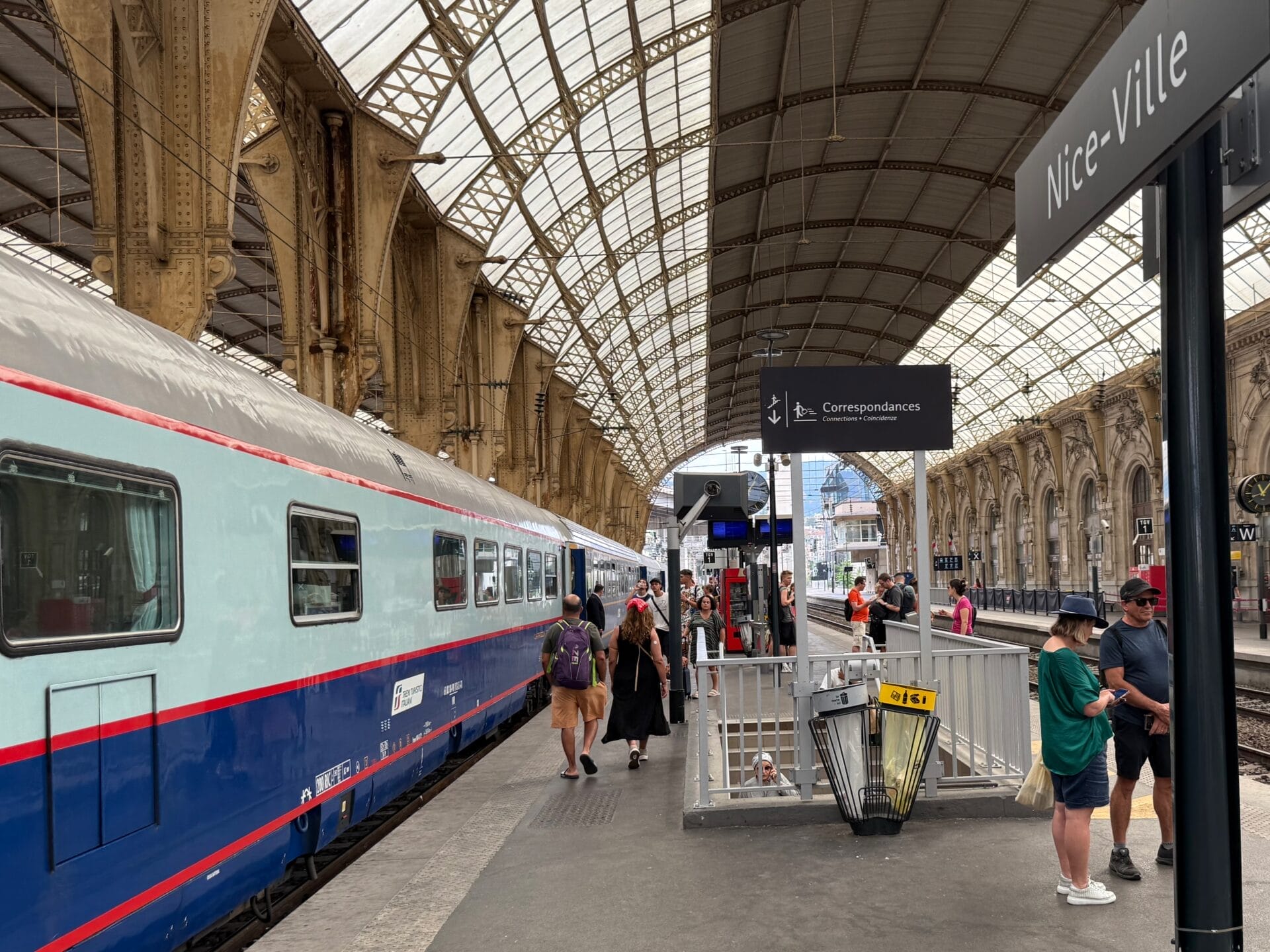 11 h 7 : arrêt à Nice-Ville. Sur le quai, de nombreux voyageurs admirent avec envie notre superbe train. Ils devront se contenter d’un banal TER car au-delà de Vintimille l’Espresso Riviera ne prend plus de voyageurs.