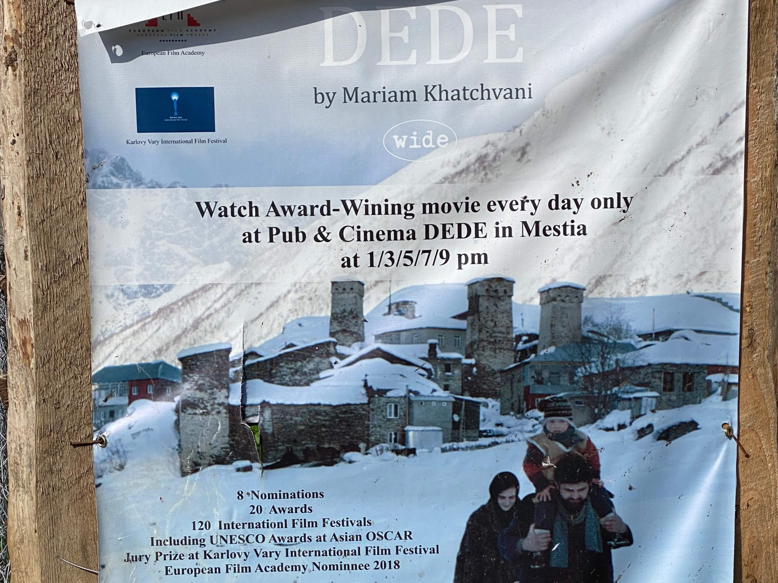 À Ouchgouli, par un après-midi pluvieux, nous sommes allés au cinéma ! Dans une grange, assis sur des bancs avec pour écran un drap tendu, nous avons vu le film « Dede » de Mariam Khatchvani. L’histoire se passe il y a une vingtaine d’années à Ouchgouli et raconte le récit d’une femme qui souhaite rompre avec les traditions et vivre sa vie comme elle l’entend. Nombre d’acteurs étaient des habitants du village. C’est d’ailleurs l’un des héros qui nous a accueillis ! Nous avons trouvé que c’était une belle manière de mieux nous plonger dans le monde de la Svanétie.