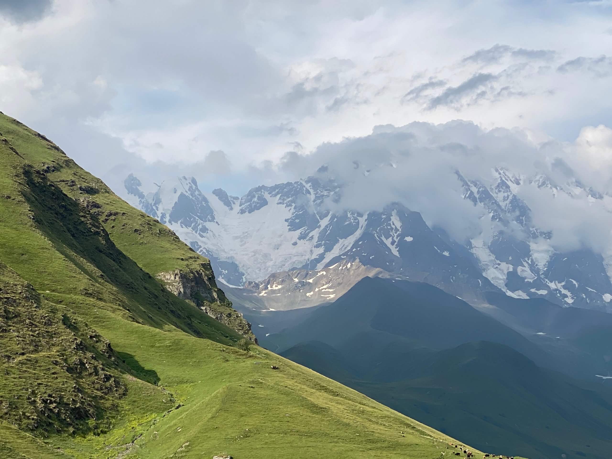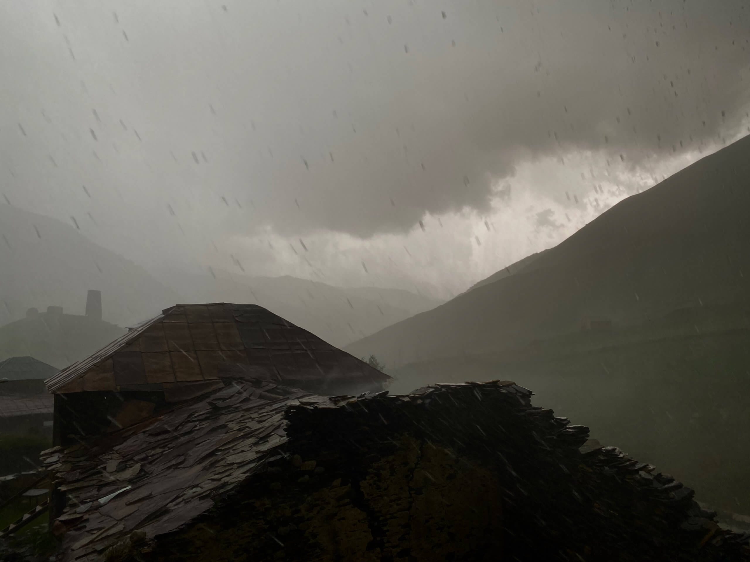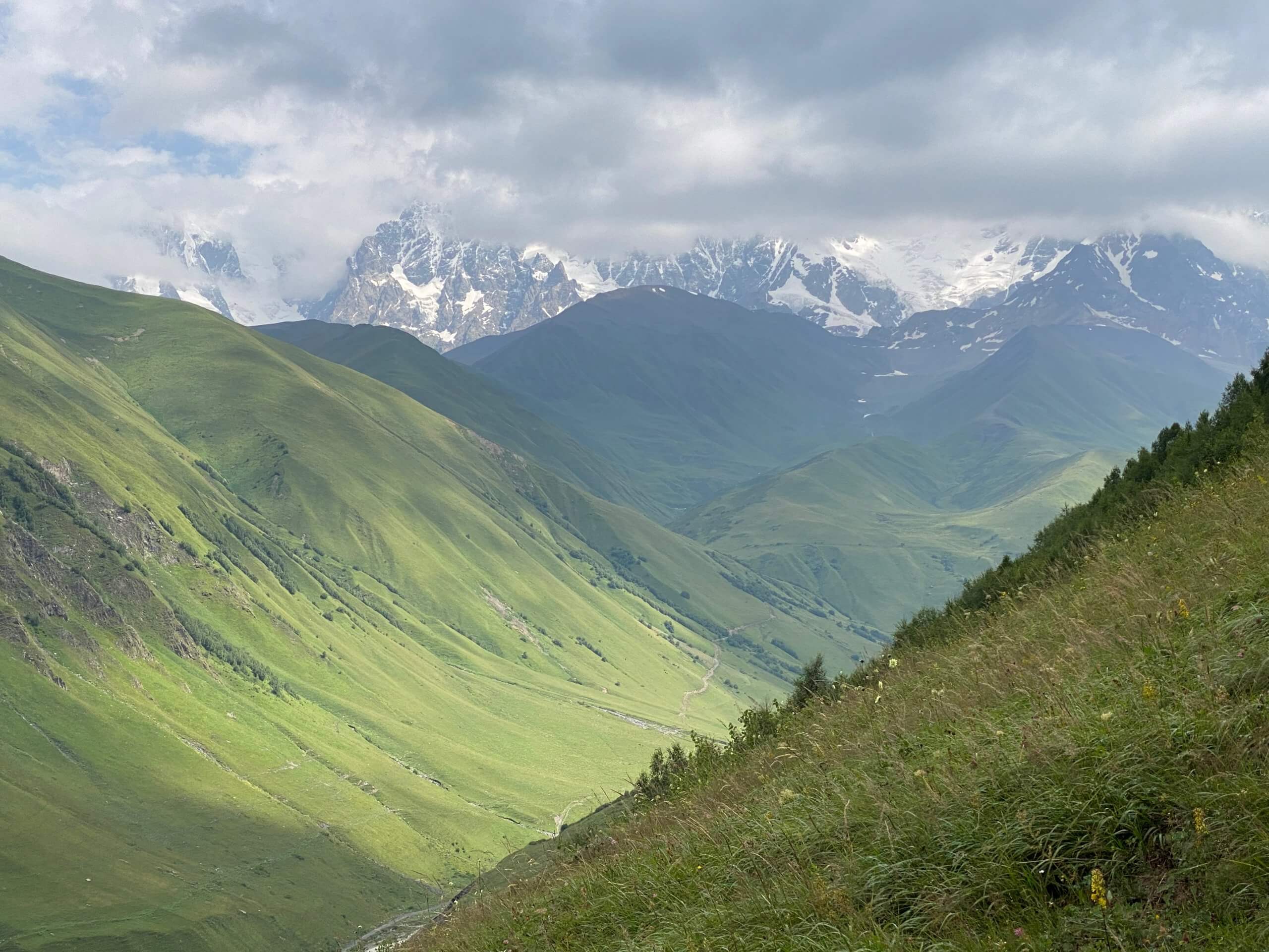 Notre séjour en Svanétie a été sous le signe de la pluie. Du coup, nos randonnées ont été plus courtes que prévu et les vues sur les sommets enneigés et les glaciers moins grandioses. Mais comme toute situation, elle a ses avantages ! Regarder des voiles de nuages apparaitre puis disparaitre sur les montagnes est un spectacle en soi. Cela donne un côté mystérieux qui incite à la rêverie.