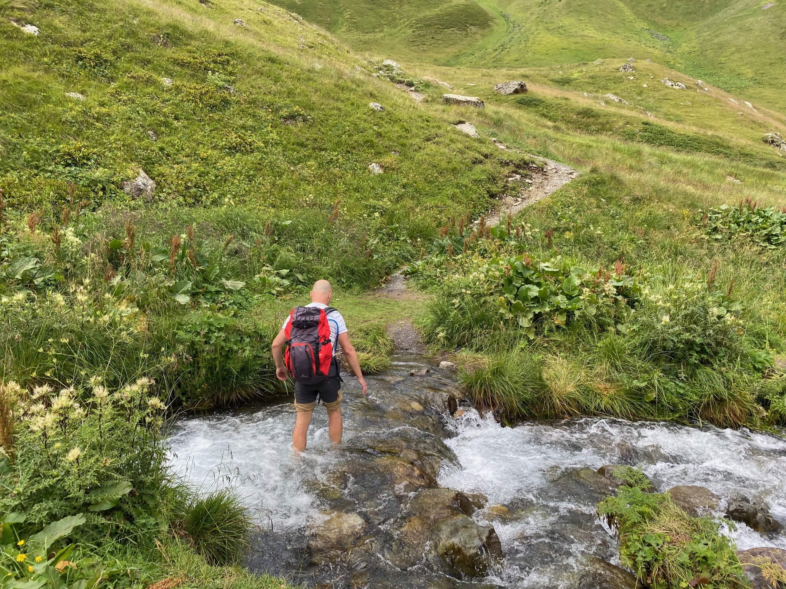 Petite astuce : en chemin, nous avons dû franchir un ruisseau. Nous vous conseillons d’avoir des sandales en plastique dans votre sac. Cela pourrra souvent vous être utile dans le Grand Caucase.